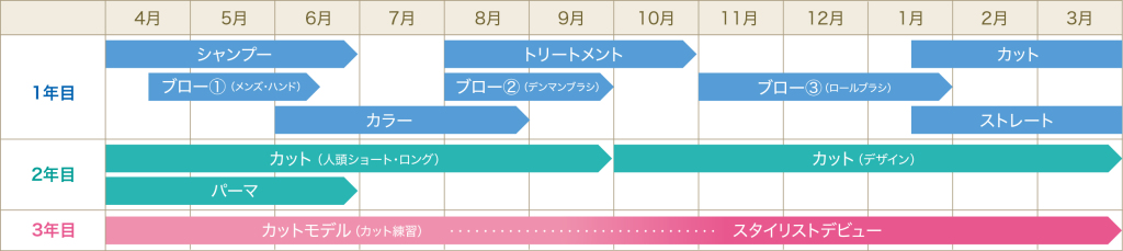 下記のように、3年を目標にスタイリストデビューを目指します。